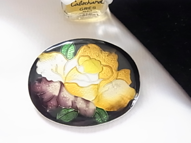 > ビンテージ/ヴィンテージ 焼き物系 七宝焼き? 美しい和モダン 黒ベースにお花柄模様 やや大き目存在感 素敵なレトロのブローチ♪♪