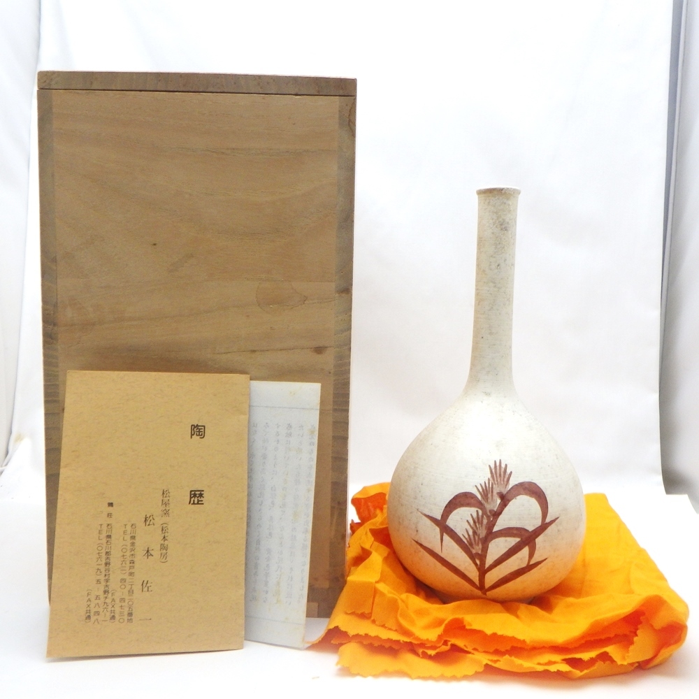> SI-125【未使用】九谷焼 松屋窯 松本佐一 鶴首 花瓶 一輪挿し 花器 銀彩 共箱・共布・陶歴・栞つき 木箱 デッドストック