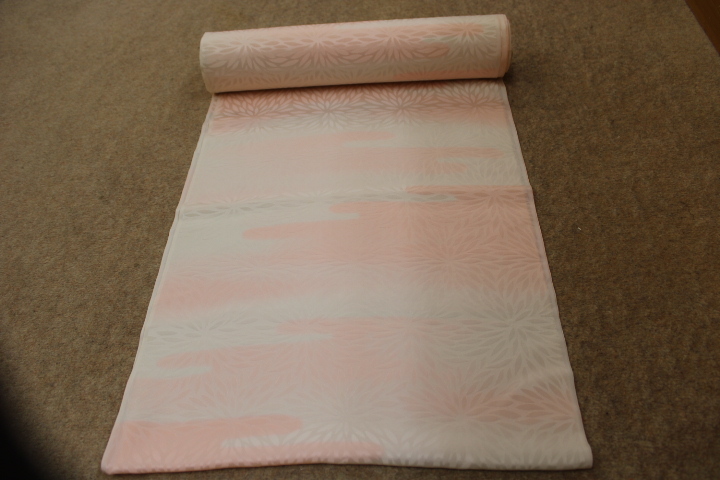 > きもの今昔8937 呉服店在庫品 長襦袢反物 正絹綸子地 菊の花尽くし地紋 ピンク色横雲濃淡染め
