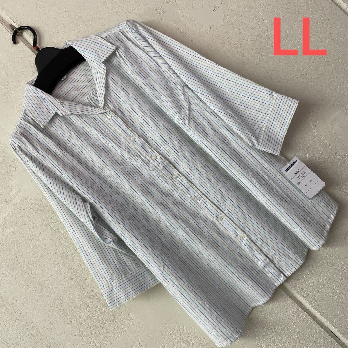 - 訳ありLLサイズ綿100%七分袖シャツブラウスグリーンブルー