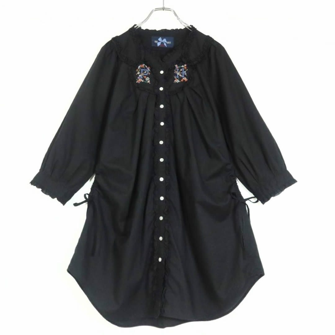 > ピンクハウス★繊細!ロゴ刺しゅう たくし上げリボン♪前開きデザイン タック使いチュニックワンピース 綿ローン 黒系* z13913