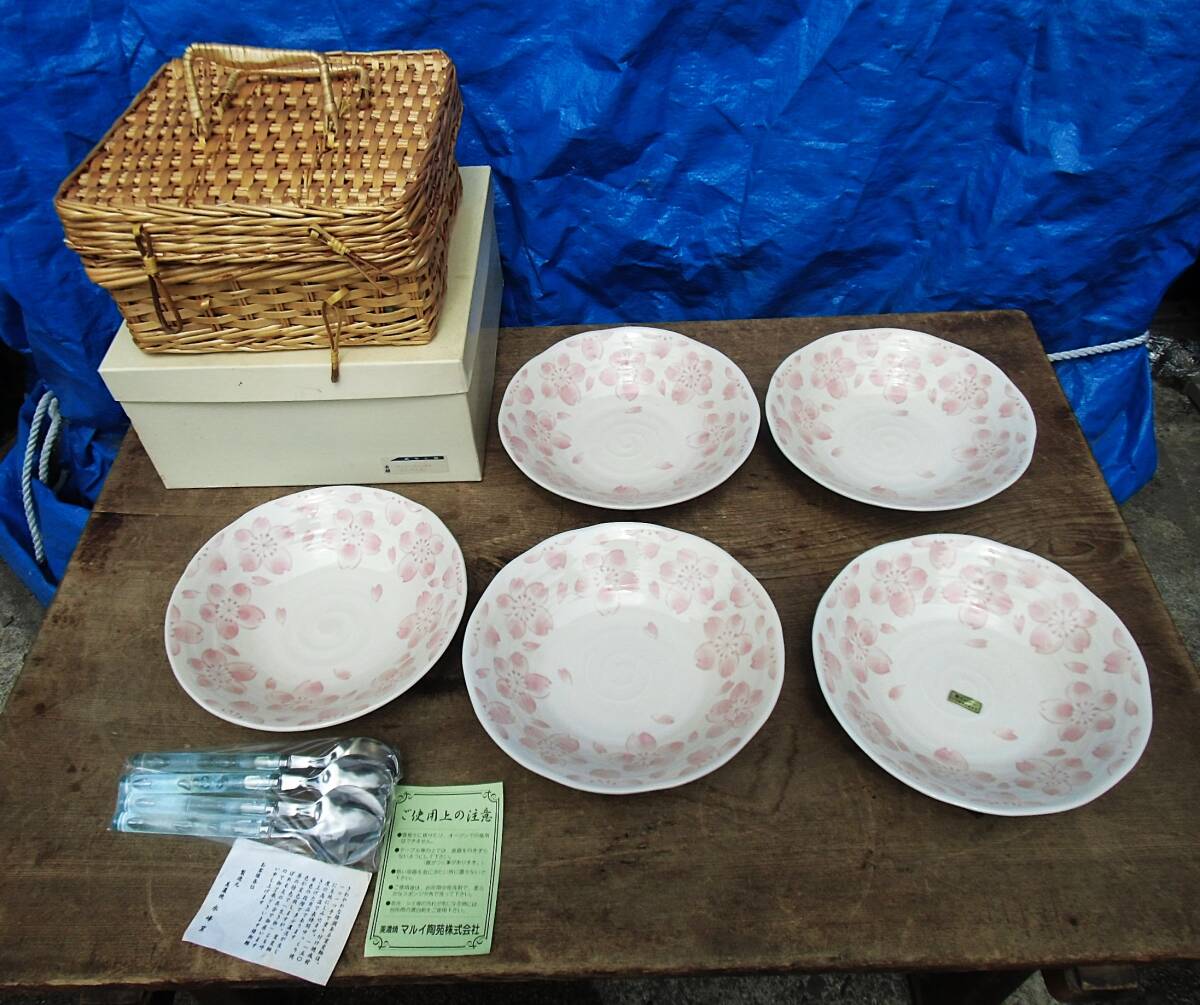 - ★ こ-866 水峰窯 美濃焼 カレー皿 5枚 未使用 桜柄 スプーン付 バスケット 皿)径21cm 高5cm 箱)高13.5cm 幅28cm 奥27.5cm 総重量2.8kg