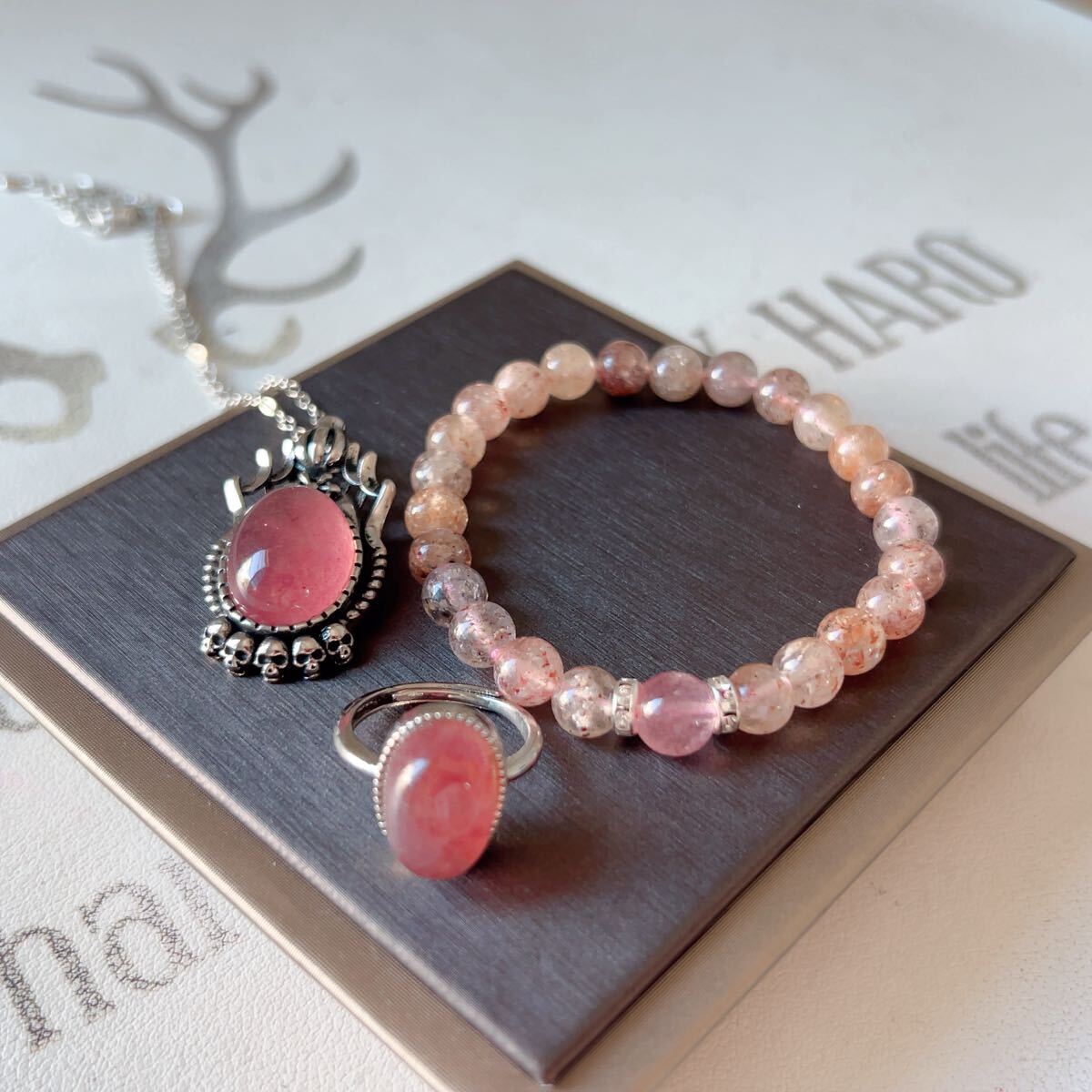 > ◇ストロベリークォーツ(苺水晶)◇ペンダント+リング+ブレスレット計3点セット◇天然石◇パワーストーン◇プレゼントにも035S919