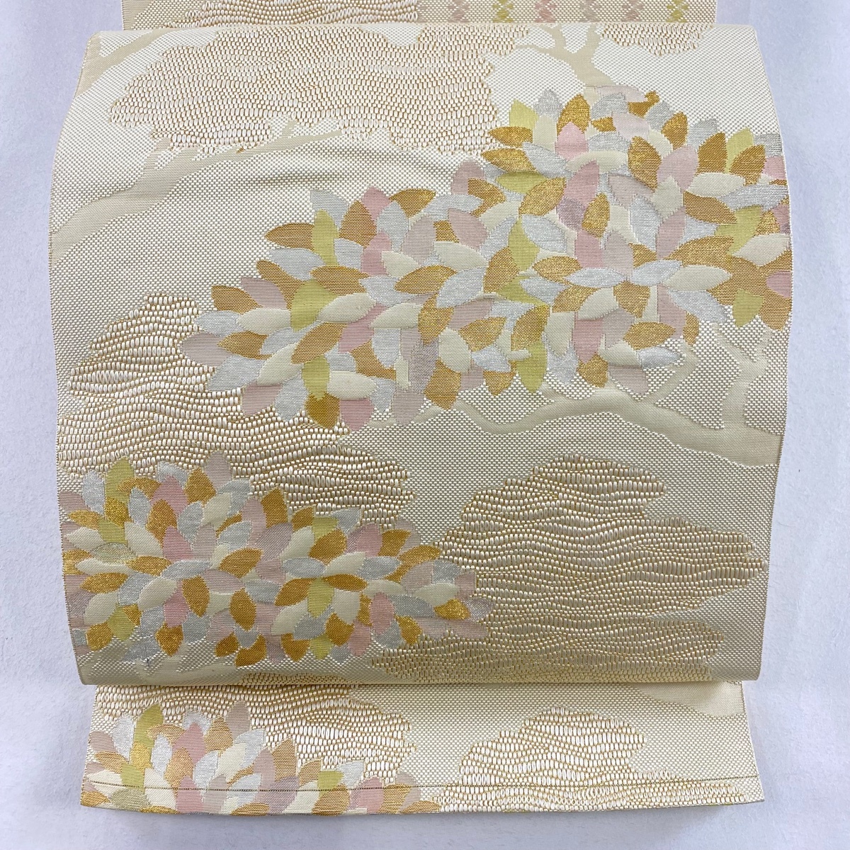 - 開き名古屋帯 名品 証紙 関西仕立て 博多織 樹木 葉柄 金銀糸 薄黄 正絹 【中古】