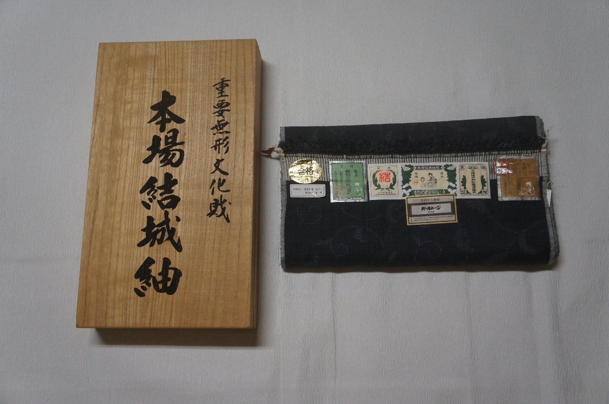 > 特選重要無形文化財本場結城紬『奥順』謹製地機100亀甲絣御召御納戸色蔓草模様反物証紙付き[T16448]
