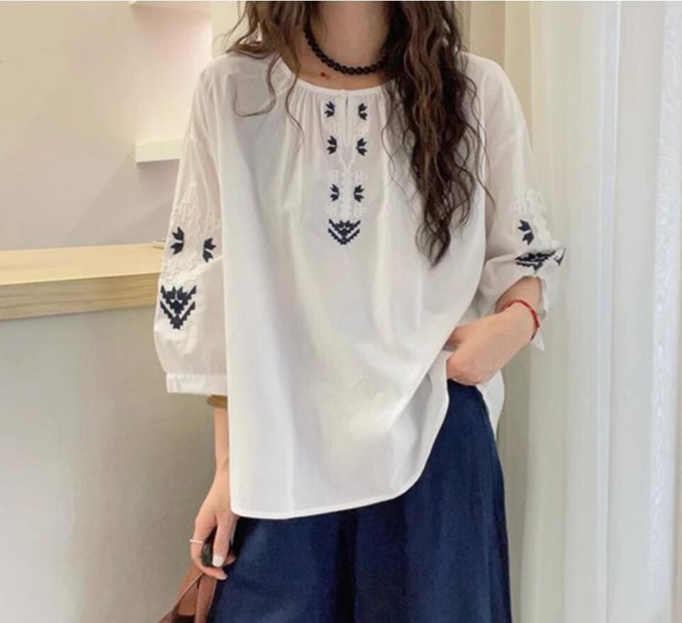 - 新入荷*上品 シャツ ブラウス レディース 五分袖 刺繍り ブラウス ゆったり 大きいサイズ 学生 通学 通勤 春 秋 おしゃれ お出かけ*白