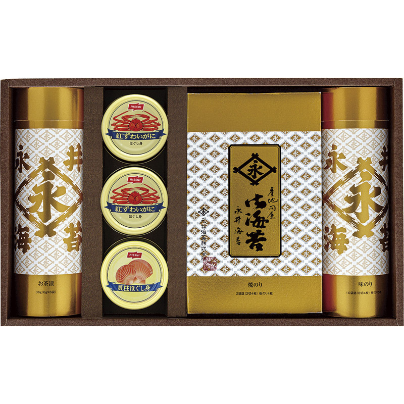 〇注意事項・送料800円が販売価格に含まれています・お取り寄せ商品です。弊社にて手配後、メーカー・卸業者からの直送になります。・まれにメーカー欠品、出荷遅延等が発生致します。問題発生時は別途メールにてご連絡致します。・配送方法の指定、日時指定、置き配、ギフト対応、他商品との同梱配送などは対応できません。・まとめ買いや複数購入の場合は通常より発送に時間が掛かる場合がございます・複数個口の場合、2階以上への搬入ができない場合があります。(その場合は1階での受け渡しとなります)・大型連休、お盆、年末年始などは発送をお休みさせていただく場合がございます・メーカー都合により、パッケージは予告なく変更される場合がございます・梱包用のダンボールはリサイクル品を使用させていただきます。・注文に関するご連絡(注文確定通知・発送通知など)はメールでご案内させていただきます※商品ページの内容について、少しでもご不明な点などがございましたら購入前に一度ご連絡ください〇商品説明あらゆるギフトシーンにおすすめです!海苔本来の味と香りを大切に焼き上げ、焼のりと味のりを中心に詰め合わせたお薦めギフト。〇商品仕様●内容:焼のり2切4枚2袋×1、味のり8切4枚10袋×1、のり茶漬6袋×1、カニ缶×2、貝柱ほぐし身×1規格●化粧箱入(425×85×260mm) 920g●加工地:日本●賞味期限:製造日より常温にて720日●アレルギー表示:小麦・えび・かに(出典:株式会社 八大)