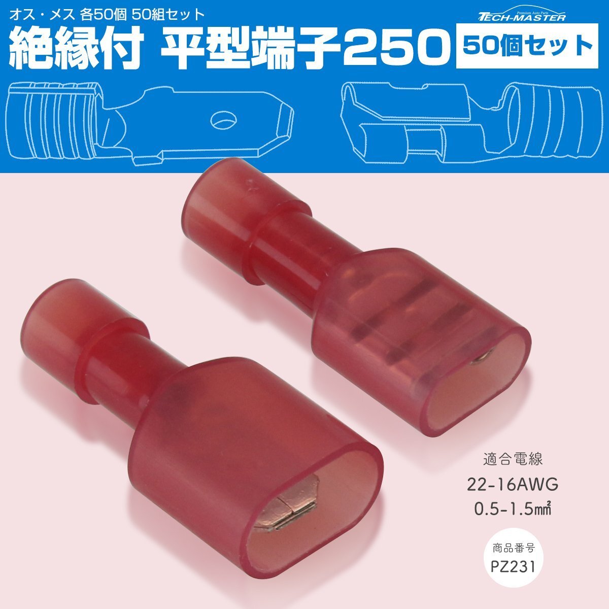 - 平型端子 250型 絶縁被膜付き ギボシ端子 オス、メス 各50個セット 22-16AWG レッド IZ231