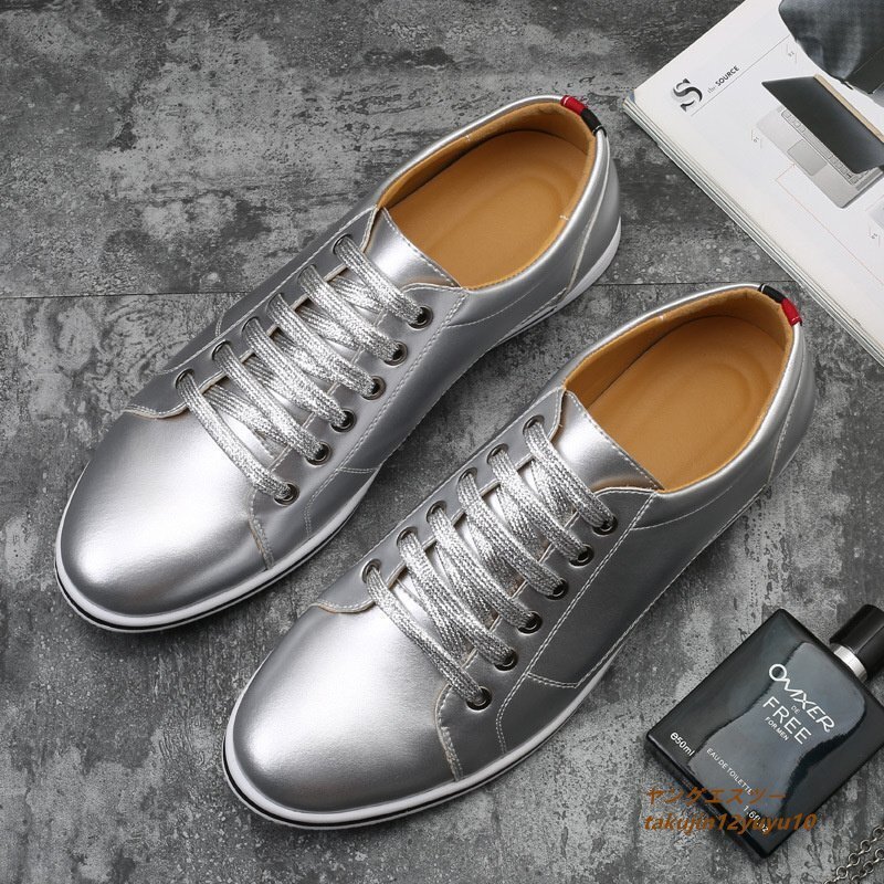 > 新品特売★スニーカー メンズ レザーシューズ 運動靴 ローファー 滑り止め ドライビングシューズ お洒落 ピカピカ 快適 シルバー 27.5cm