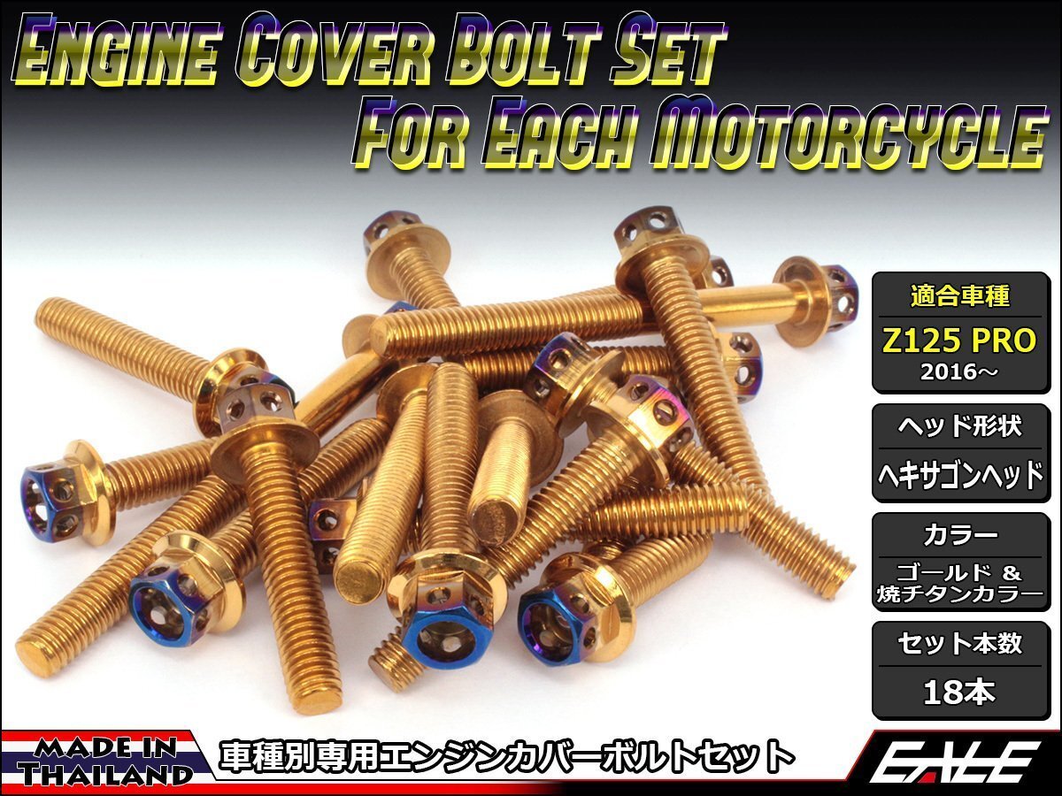 > Z125 PRO(BR125) エンジンカバー ボルト18本セット ステンレス製フランジ付六角ボルト CTCヘキサゴンヘッド ゴールド&焼チタンカラーTB8035