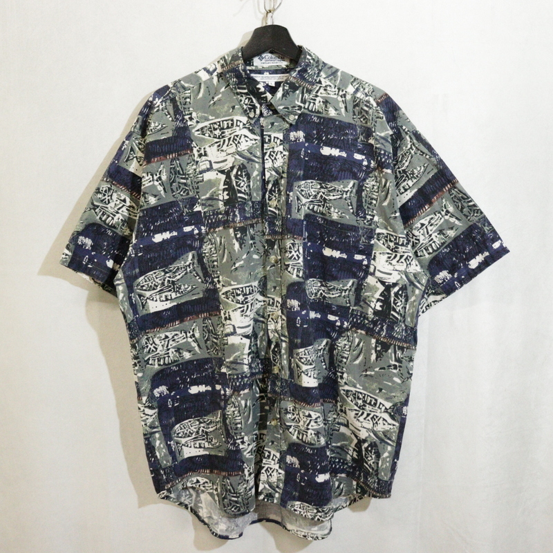 - Q831 90sビンテージ コロンビア 半袖シャツ■1990年代製 表記Lサイズ ネイビー ボタンダウン 総柄 アニマル アメカジ 古着 古着卸 激安