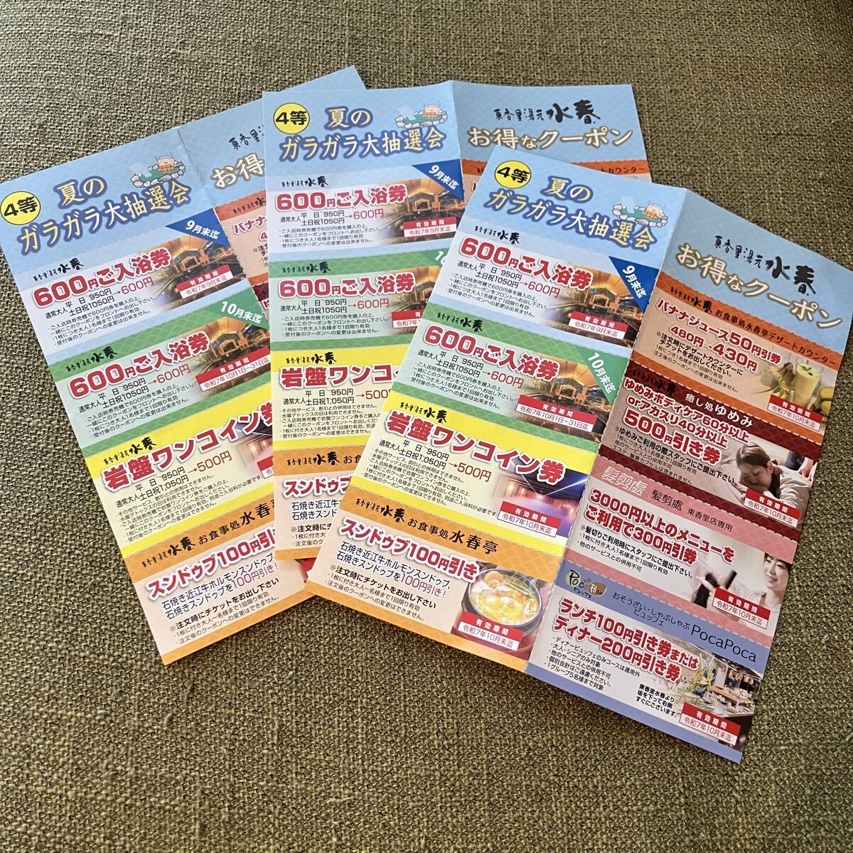 - 3枚セット 水春 東香里湯元 夏のお得クーポン 割引券 ガラガラ大抽選会