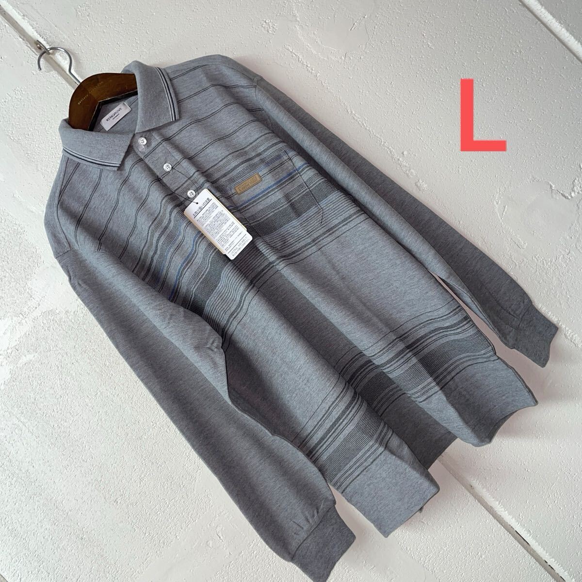 - Lサイズメンズ胸ポケット長袖ポロシャツグレー