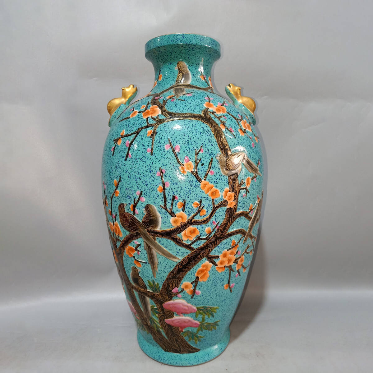 - TM9#8343【3.1】中国骨董 人間国宝 磁器【清乾隆帝浮彫りカササギ登梅図紋元金福筒】工芸品 施釉陶 青花磁 陶芸 精美彫 置物 收藏品