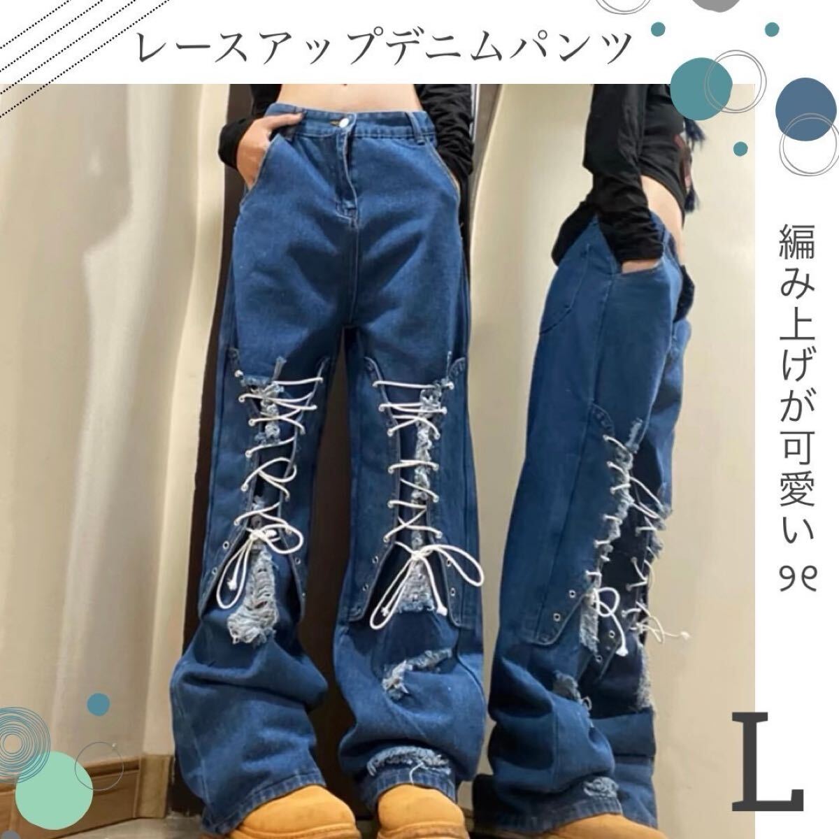 - 新品!レースアップ デニムパンツ L 編み上げ Y2K ストリート 韓スト