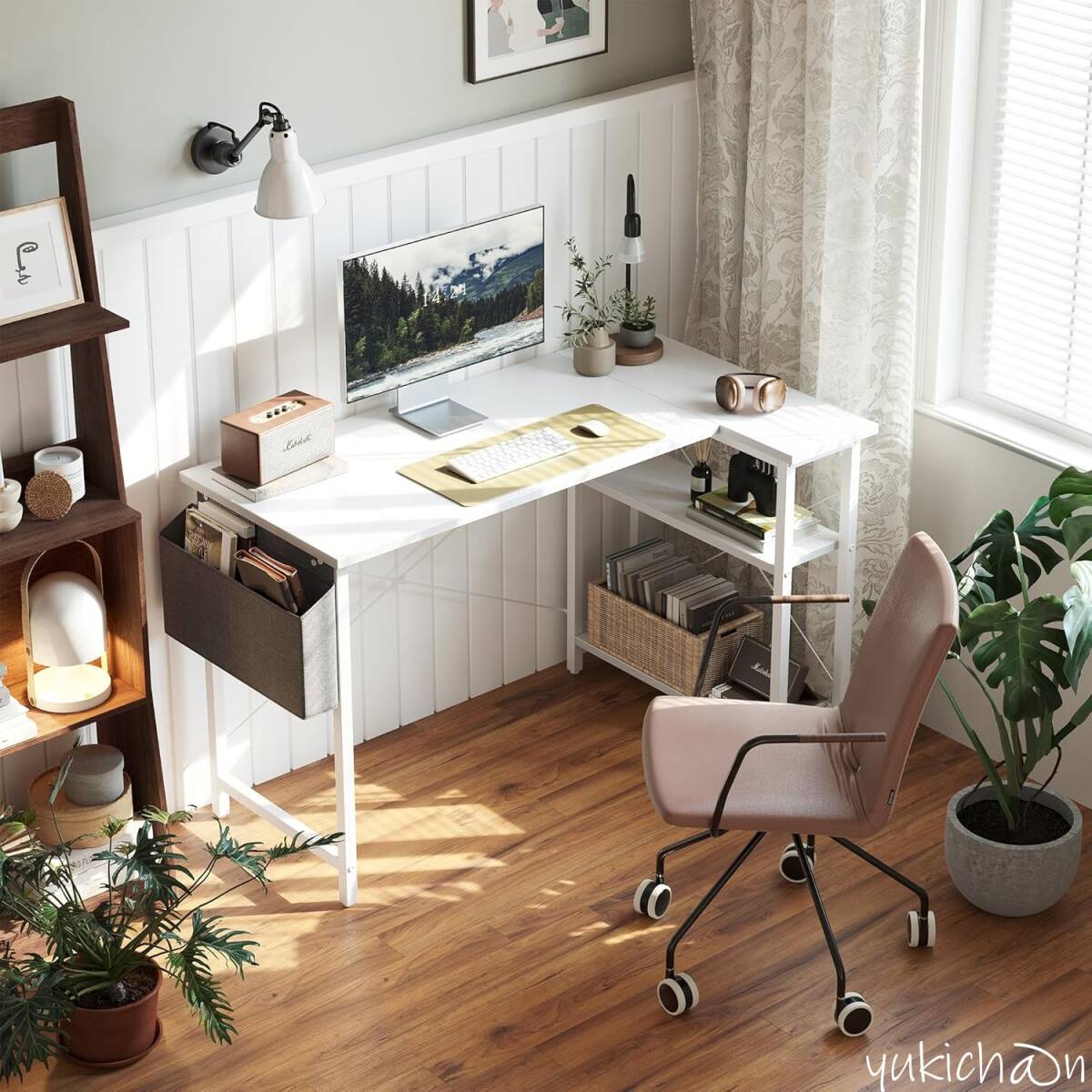 - L字デスク ゲーミングデスク デスク ホワイト 幅120cm パソコンデスク 机 ラック付きデスク 右棚左棚 コーナーデスク 収納袋付き