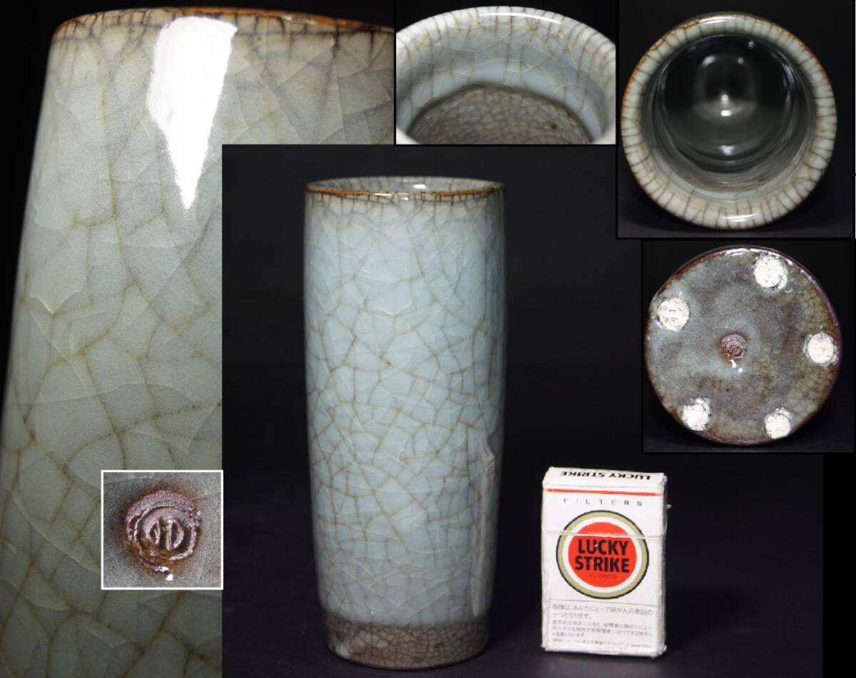 > 真贋保証■人間国宝 清水卯一 造■ 青磁 青瓷花瓶 高約23cm 箱無 花入 花生 花器 飾壷 石黒宗麿氏に師事 検:中国美術 貫入