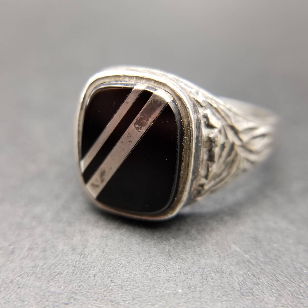 - オニキス スラッシュライン 925 シルバー シグネット リング 銀 指輪 フローラル サイド装飾 クラシカル メンズジュエリー Y24-L