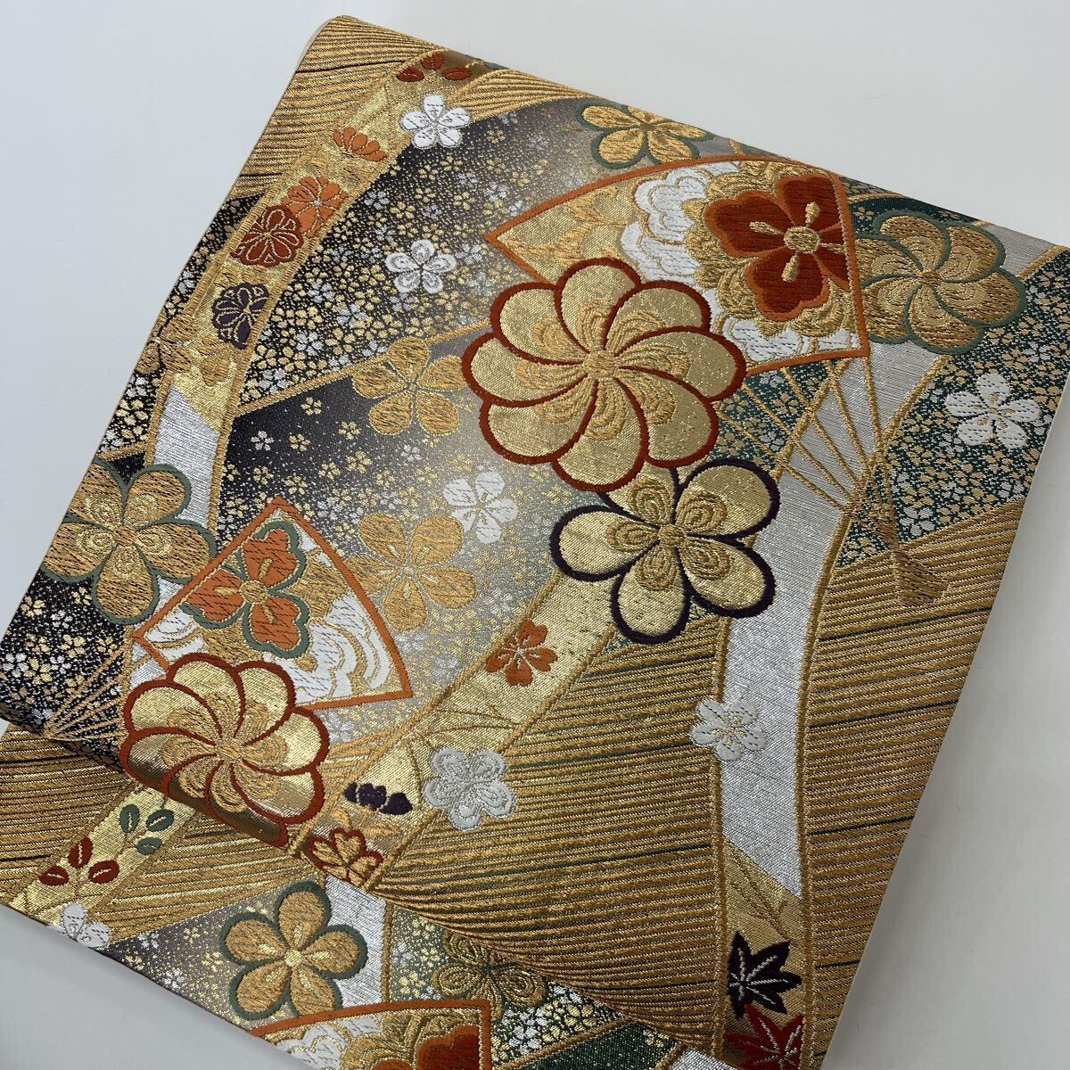 - 袋帯 古典柄 金彩 扇子に花 唐織 正絹 W-413.8