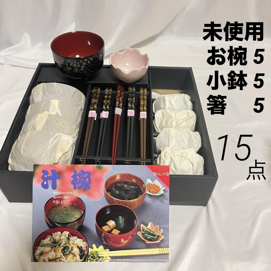 - 未使用 花友禅 食彩揃 御椀 小鉢 箸 各5客 15点セット 日本製 汁椀 おわん すべらない箸