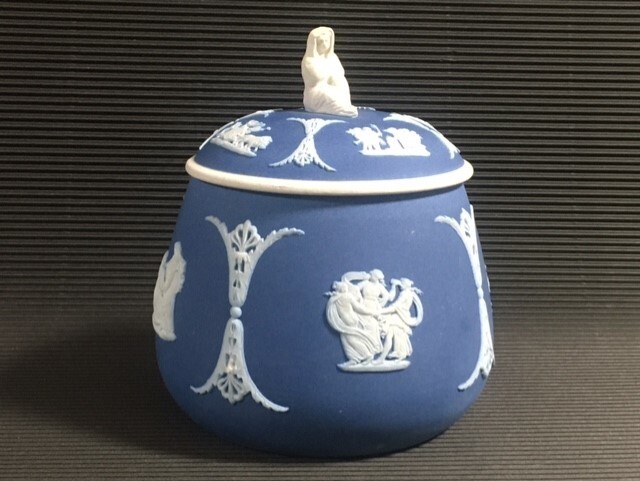- ◎ウェッジウッド 青色を被せた白のジャスパー 貴重な蓋物 未亡人像の蓋つまみ◎箱付