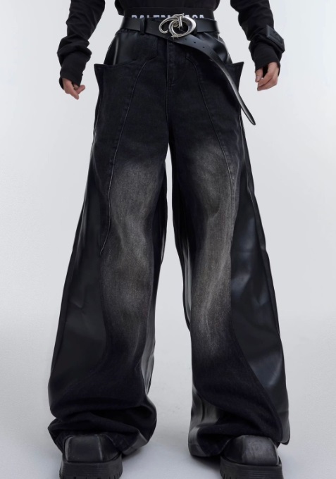 - 新入荷 デニムパンツ ジーンズ オートバイ ワイドパンツ メンズ PU切り替え ハロンパンツ アメカジ 黒/2XL