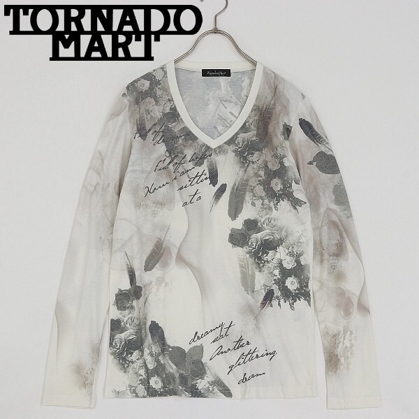 - 【HA216】◆TORNADO MART トルネードマート 羽 フェザー×バラ柄 Vネック ロンT 長袖 Tシャツ 白 ホワイト