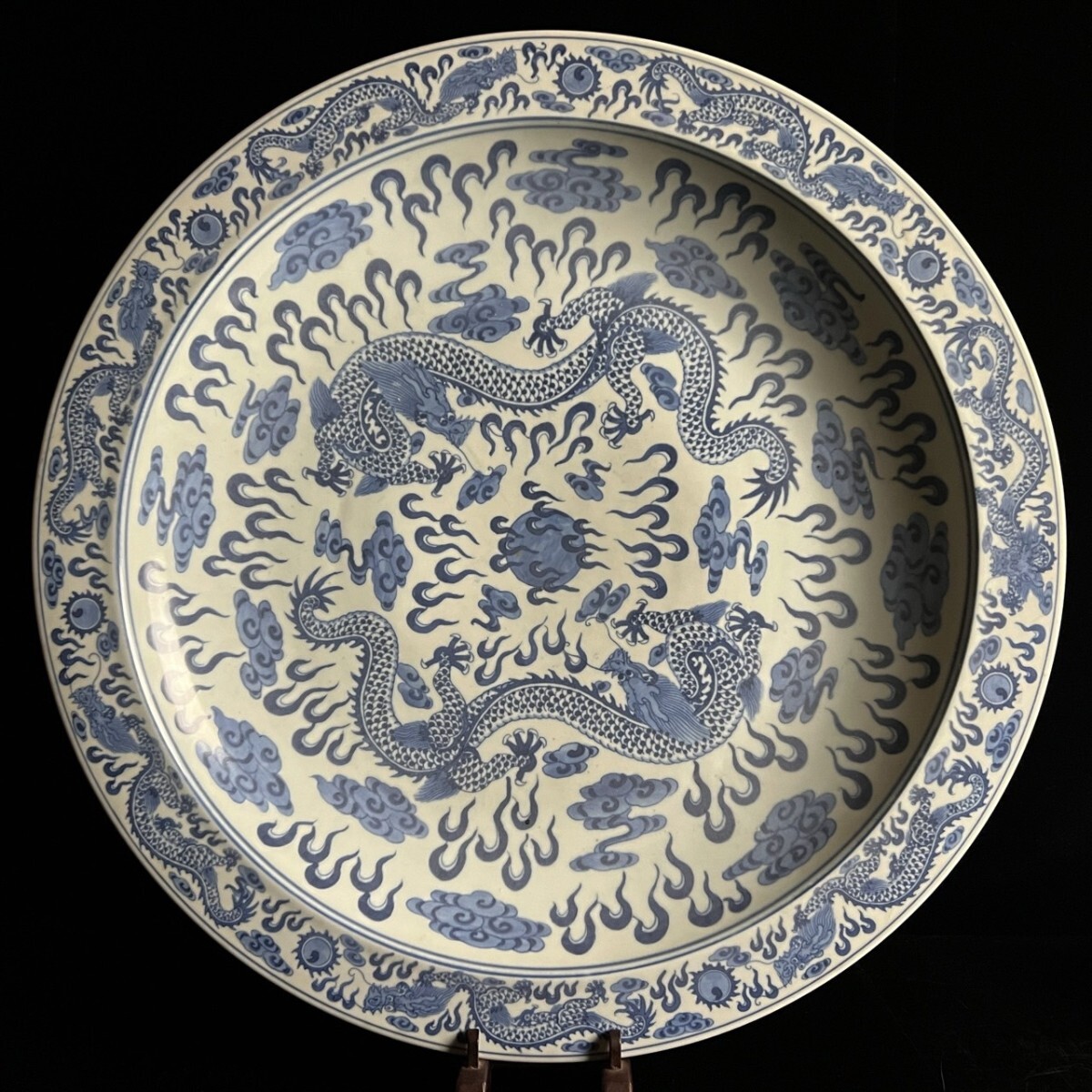 > 中国美術 双龍青花文染付大皿 特大60.5cm 細密絵付 時代物 中国古玩 八龍雲図大皿 大鉢 古美術品 唐物骨董[麌]