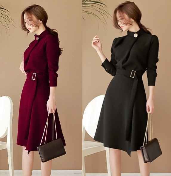 - ひざ丈ワンピース フリルワンピ 長袖ワンピ きれいめ オフィスカジュアル 秋冬 S ワインレッド