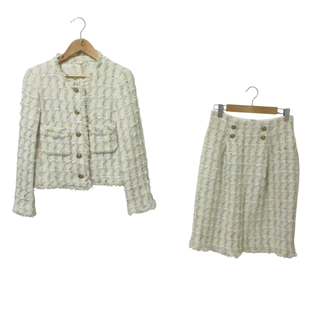 > 良品 ANAYI アナイ ジュールトゥルニエ パステルツイード ノーカラー ジャケット スカート スーツ セットアップ 36 オフホワイト