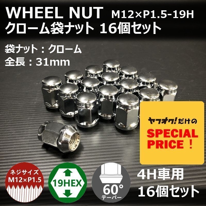 - SALE ホイール袋ナット(クローム)16個セット M12XP1.5-19HEX 4H車用(ラグナット ホイールナット 4穴 メッキ)