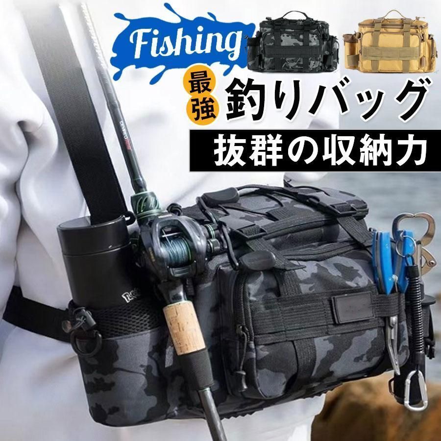 - 釣りバッグ フィッシングバッグ ロッドホルダー 大容量 ウエスト ヒップバッグ 防水 タックル 計量 ショルダー 迷彩 鞄 カバン 釣具