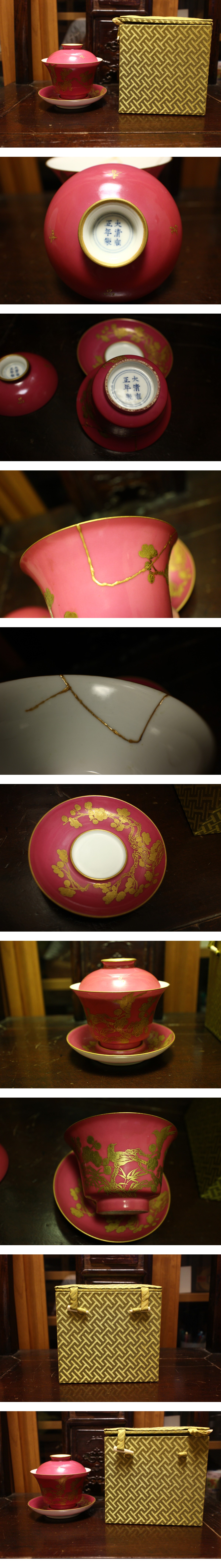 > 大清雍正年製 金彩花鳥紋蓋茶碗 共箱(金繕直しあり) 中国美術骨董茶道具茶碗唐物中国古玩煎茶具鉄瓶銀瓶茶托茶筒湯沸掛軸純銀