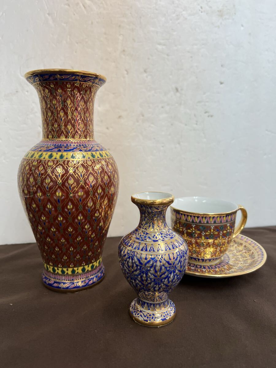 > 【ゆ60】タイ ベンジャロン焼き ハンドペイントカップ&ソーサー 花瓶 花入 花器 飾壺 壺 金彩 置物 Gold12k