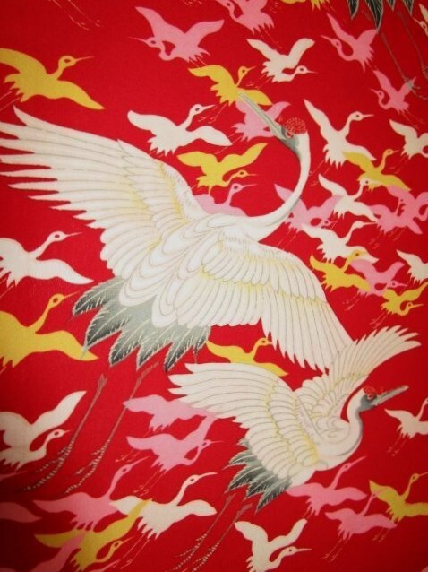 - F-48★赤地*鶴*飛鶴*正絹*古布はぎれ★吊るし雛/市松人形/一閑張り/文化人形