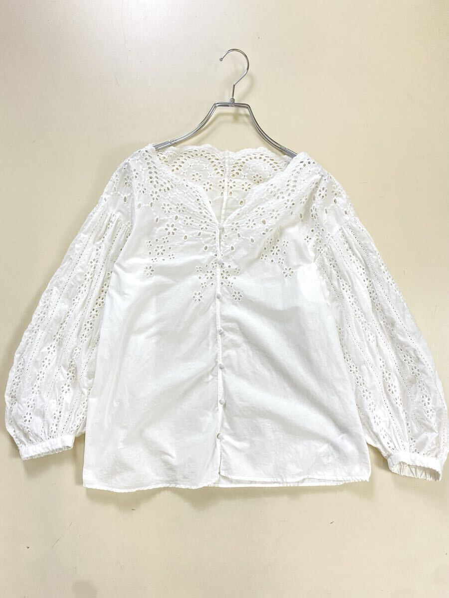 - ● Spick& Span ◆ゆったりシルエット♪ アイレット レース ブラウス 白 刺繍 Vネック 長袖シャツ スピック&スパン ◆W5 DいOCE-02