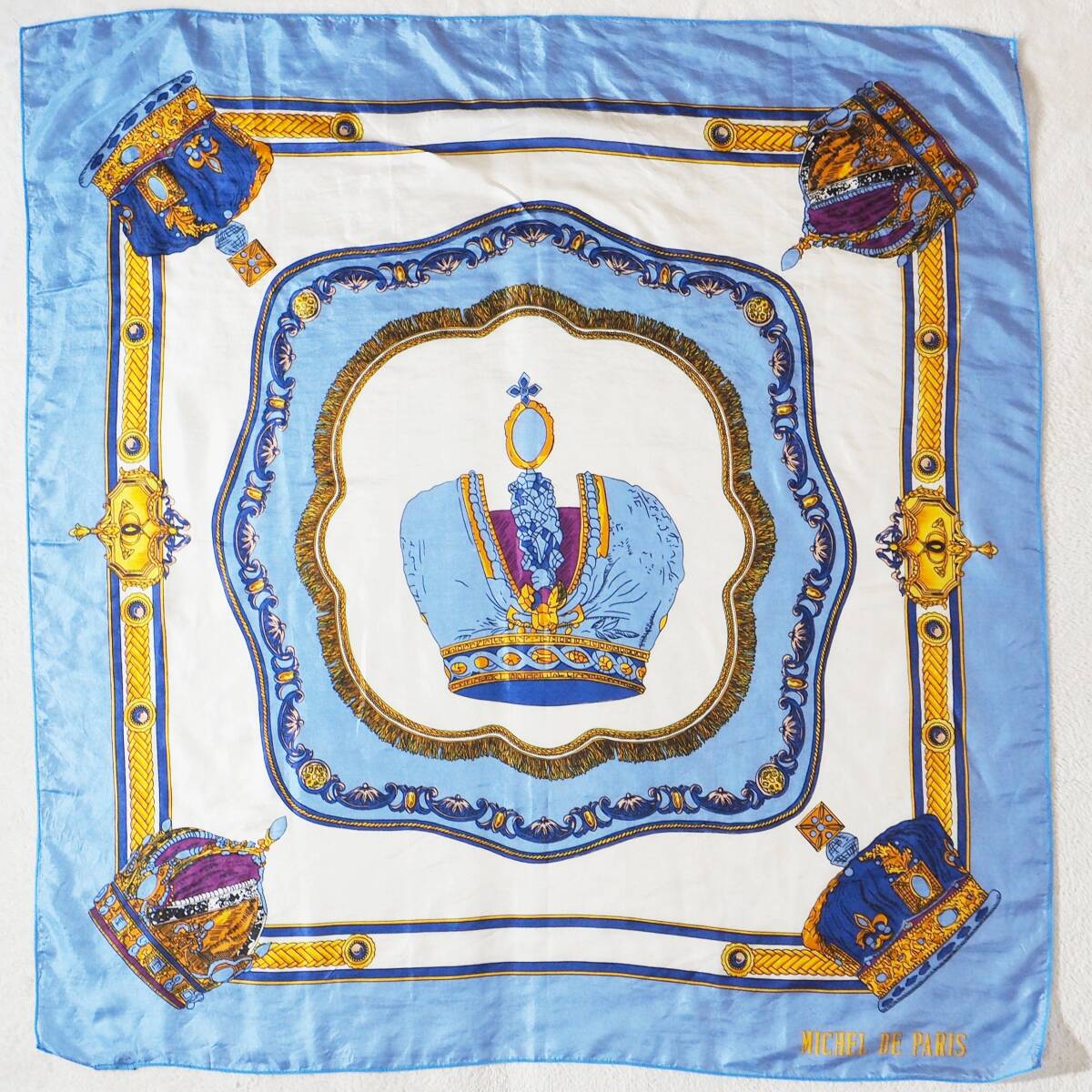 - MICHEL DE PARIS ピュアシルク100% スカーフ 王冠柄 水色 大判