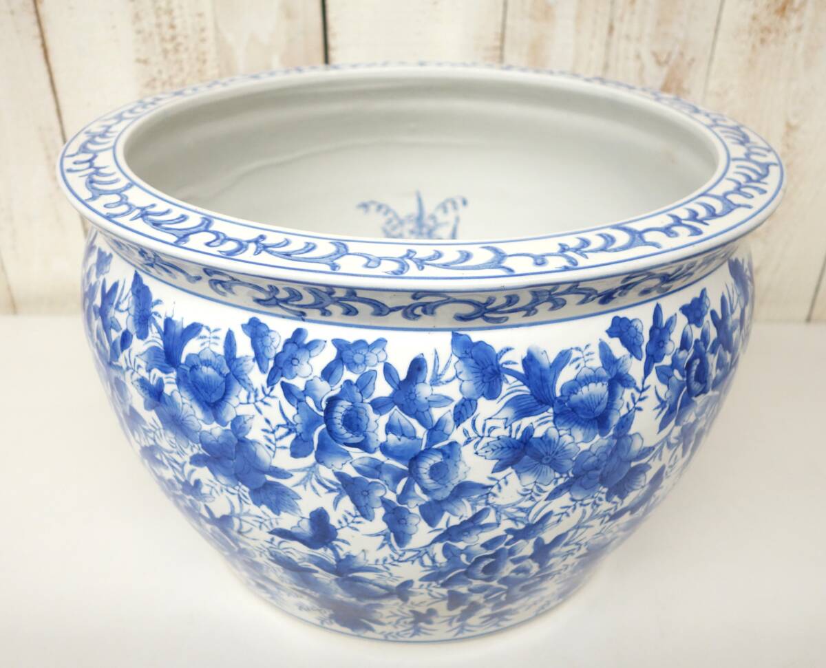 - 伝統工芸 工芸美術 レトロ *大型染付鉢 睡蓮鉢 大火鉢 水鉢 メダカ鉢 金魚鉢 植木鉢 鉢入 カバー *花唐草文 内花文