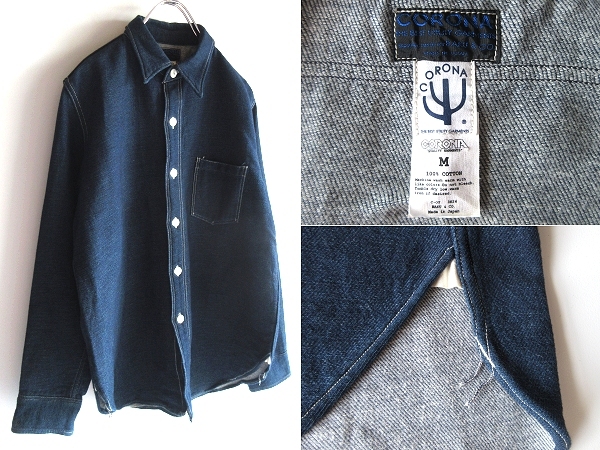 > CORONA コロナ 猫目ボタン マチ付 コットン スウェットデニムシャツ ジャケット M インディゴ 日本製 元ポストオーバーオールズ/POST OALLS