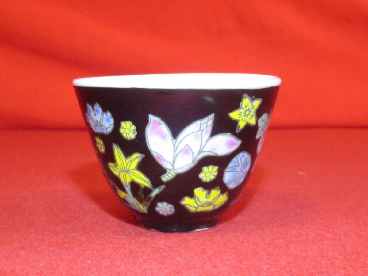- 中国美術 煎茶道具 中国陶磁器『黒地十錦手色絵粉彩花尽くし文煎茶碗 在銘「中国景徳鎮」』