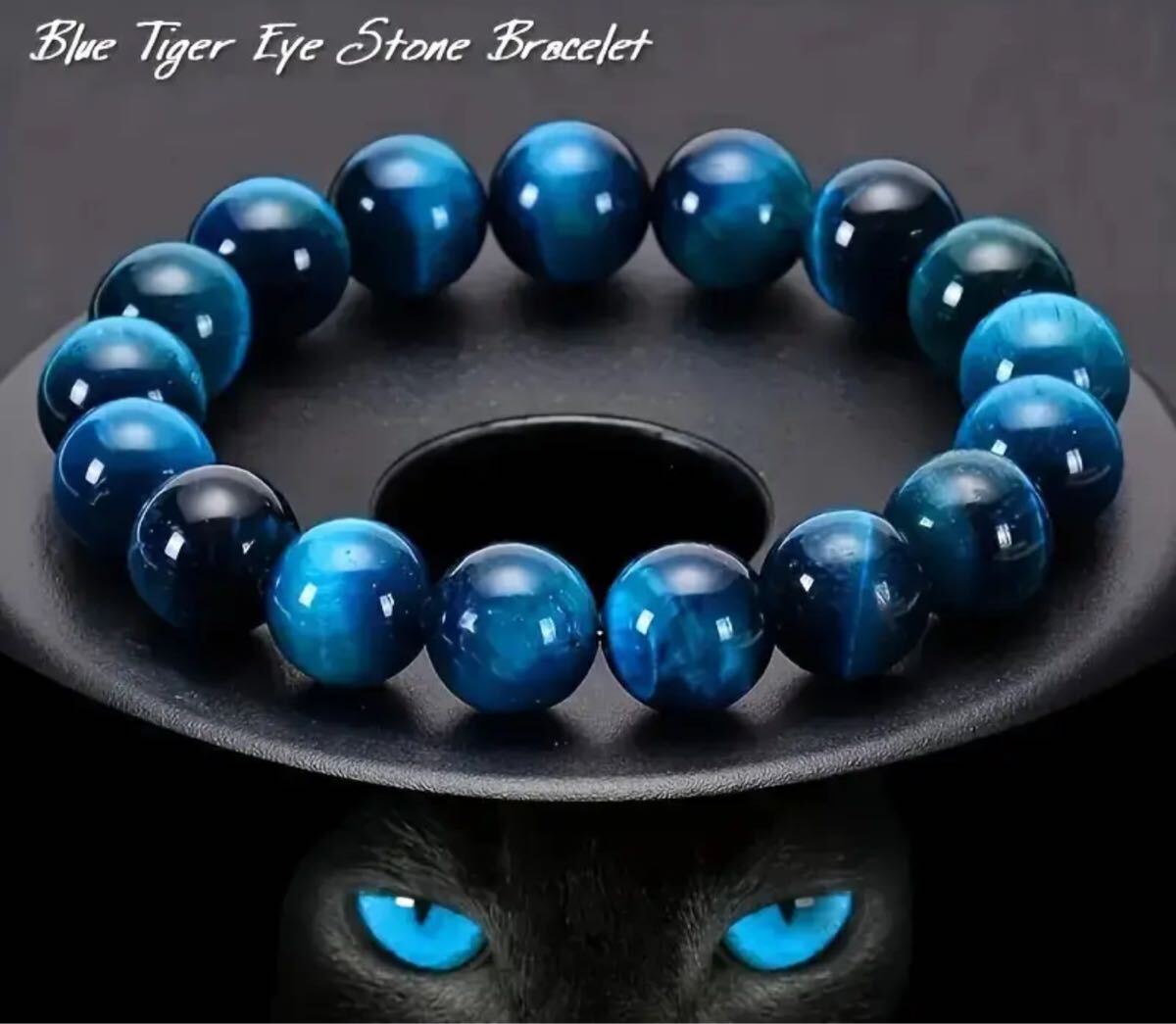 - 天然石 パワーストーンメンズ ブルータイガーアイストーンブレスレット - 深い青のマーブルパターンと黒い斑点、滑らかな球形ビーズ