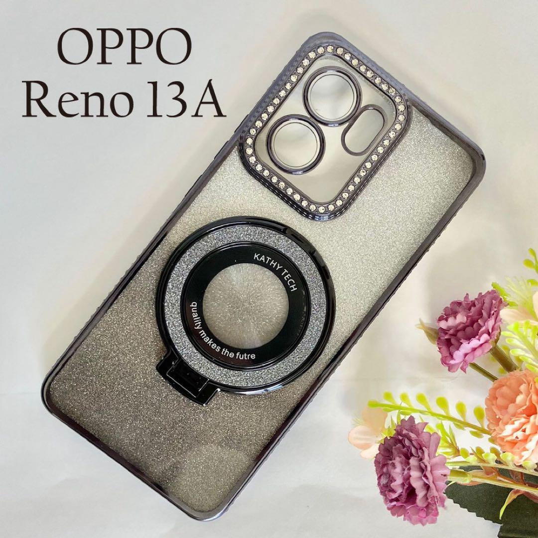 > OPPO Reno 13Aケース キラキララメシート、 リングホルダー付:ブラック ☆おまけガラスフィルム付