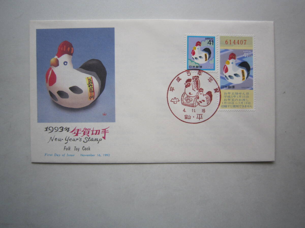 - ●初日カバー 1993年年賀切手 富山のにわとり●