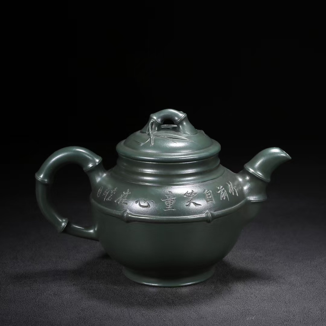 - 【美の継承】旧家蔵出 紫砂壺【竹韻】金鼎商標 蓋款馮桂林 朱泥 原鉱緑泥 茶壺 急須 茶道 宜興 唐物 中国古美術 中国茶器 古玩 R07091119