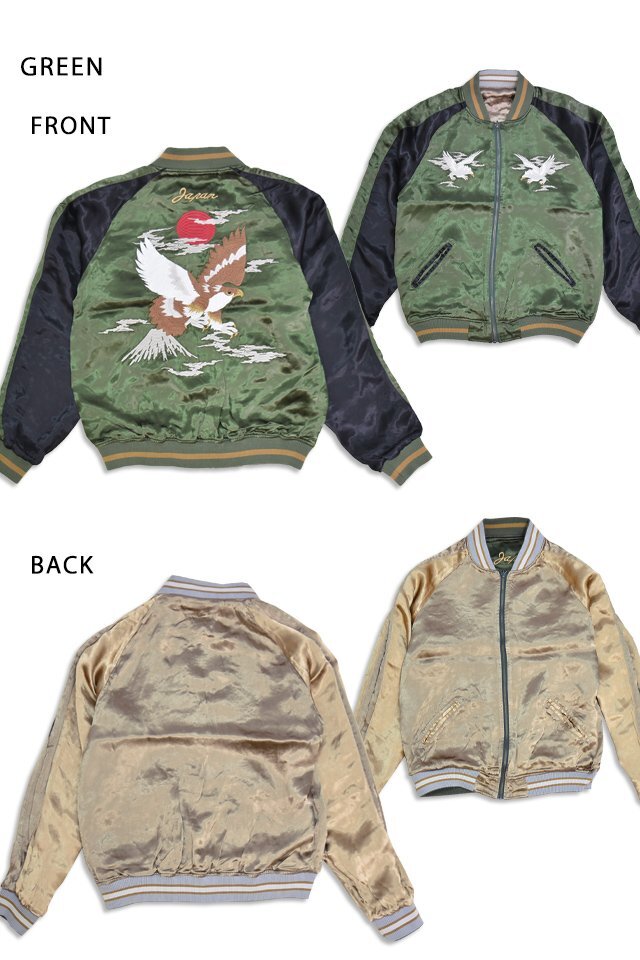 - 【ZIPANG LUXE】ALL振り刺繍オーバーダイ加工リバーシブルスカジャン「鷹」◆絡繰魂 グリーン Lサイズ 253021 和柄 和風 スーベニア