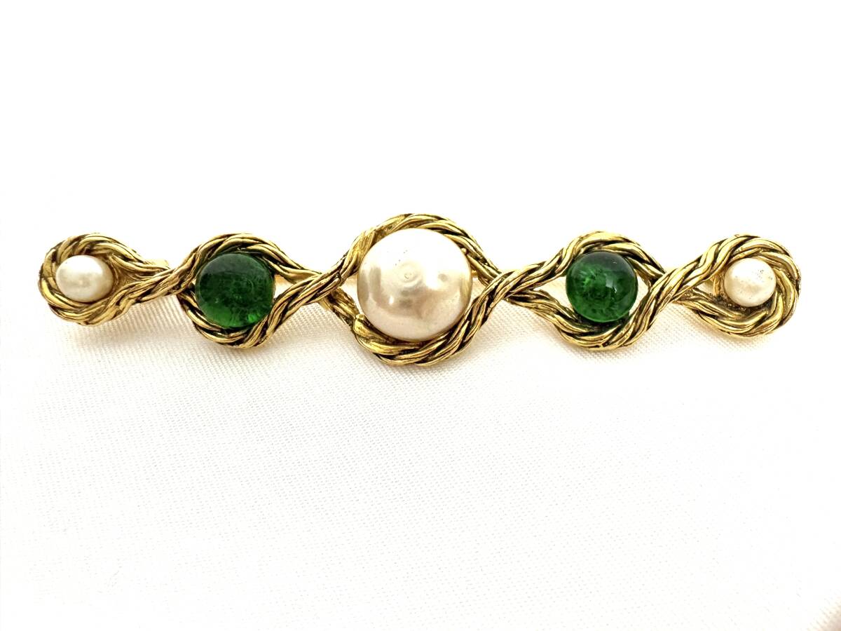 > 7I1401【本物保証】シャネル ブローチ グリポア グリーン ストーン フェイク パール ゴールド 102 1982 年製 vintage CHANEL