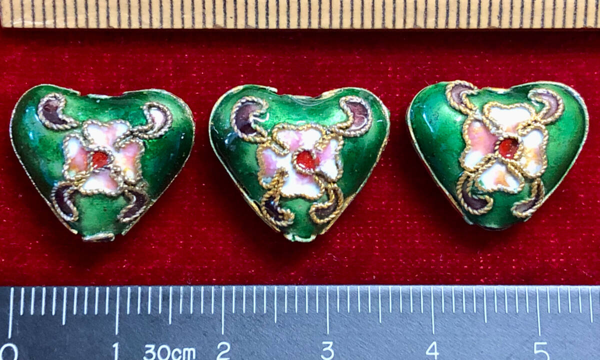 > ¶!¶ 有線七宝焼ワールド - 3個のハート型ペンダント ¶!¶ 約厚8㎜×横17㎜×縦15㎜ 金線に深緑釉 手作 手芸 工芸 インテリア ペンダント