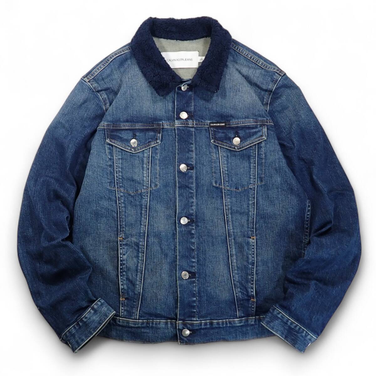 - 7046/Calvin Klein Jeans襟ボア デニム トラッカージャケットL●濃い目GジージャンカルバンクラインジーンズCK ビンテージ加工●洗濯済古着