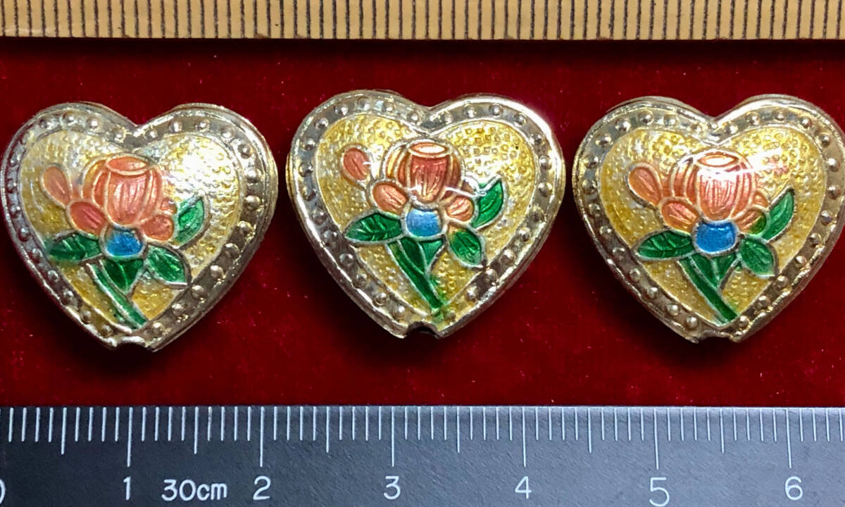 > ¶!¶ 有線七宝焼ワールド - 3個のハート型ペンダント ¶!¶ 約厚8㎜×横21㎜×縦18㎜ 金線に金色釉橙色薔薇 手作り 手芸 工芸 インテリア