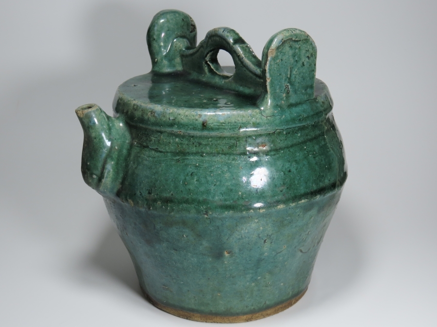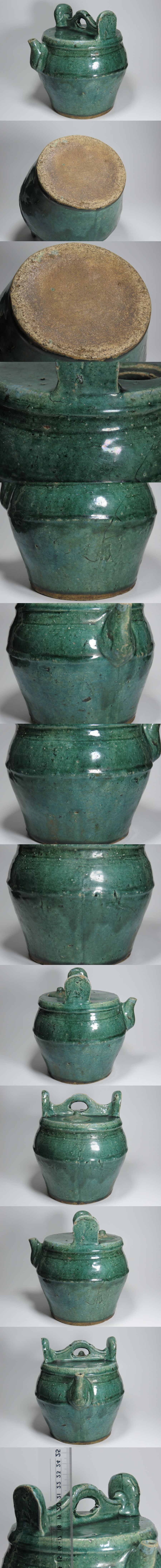 - 東南アジアの陶器.緑釉の模様.水注模様.蓋付き.窯傷や灰のふりものや引っ付きや汚れやチップ状の傷などあります。